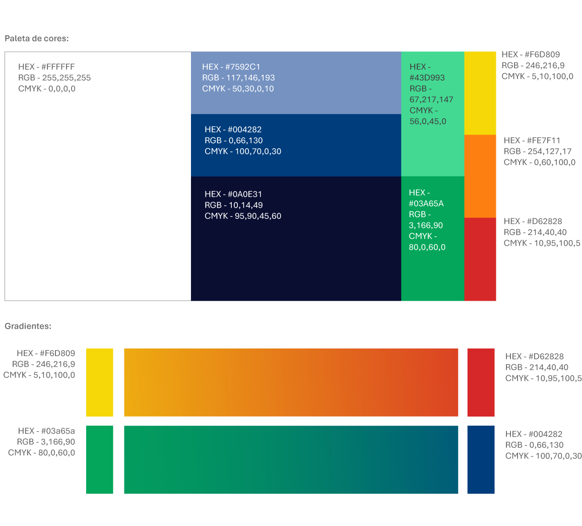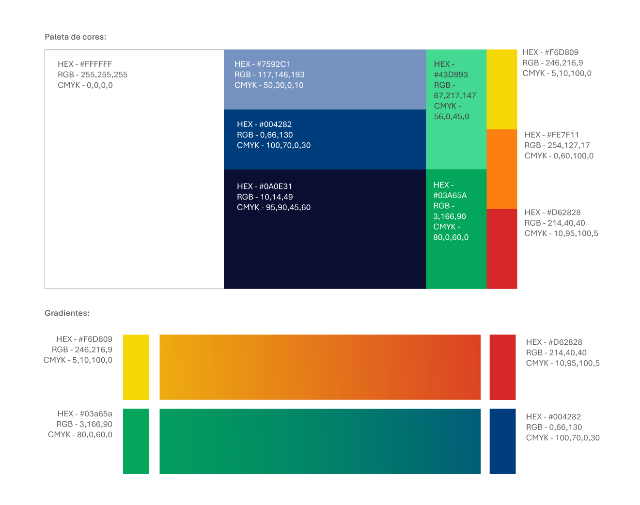 Junto às cores são apresentados os códigos HEX e RGB para uso em mídias digitais e CMYK para a mídia impressa.
