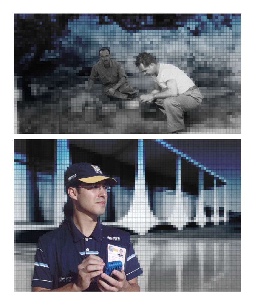 Ao pixelar somente o fundo das imagens históricas, destacando a figura das pessoas, pretende-se marcar duas posições: As pessoas é que são a instituição e que, por consequência, a instituição, o IBGE, está inserida no ambiente digital.