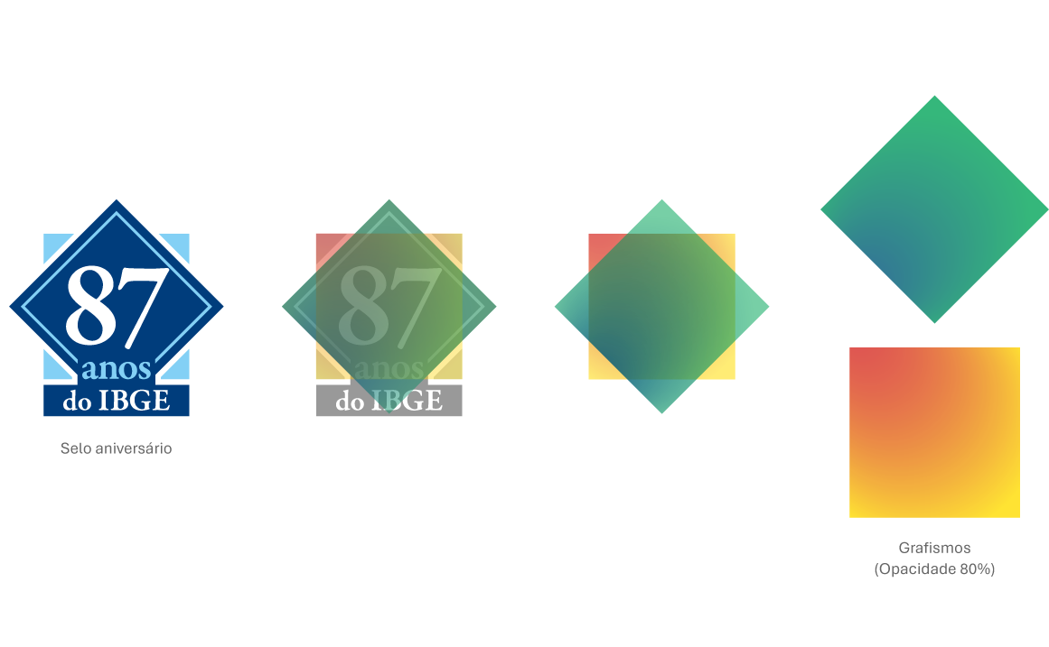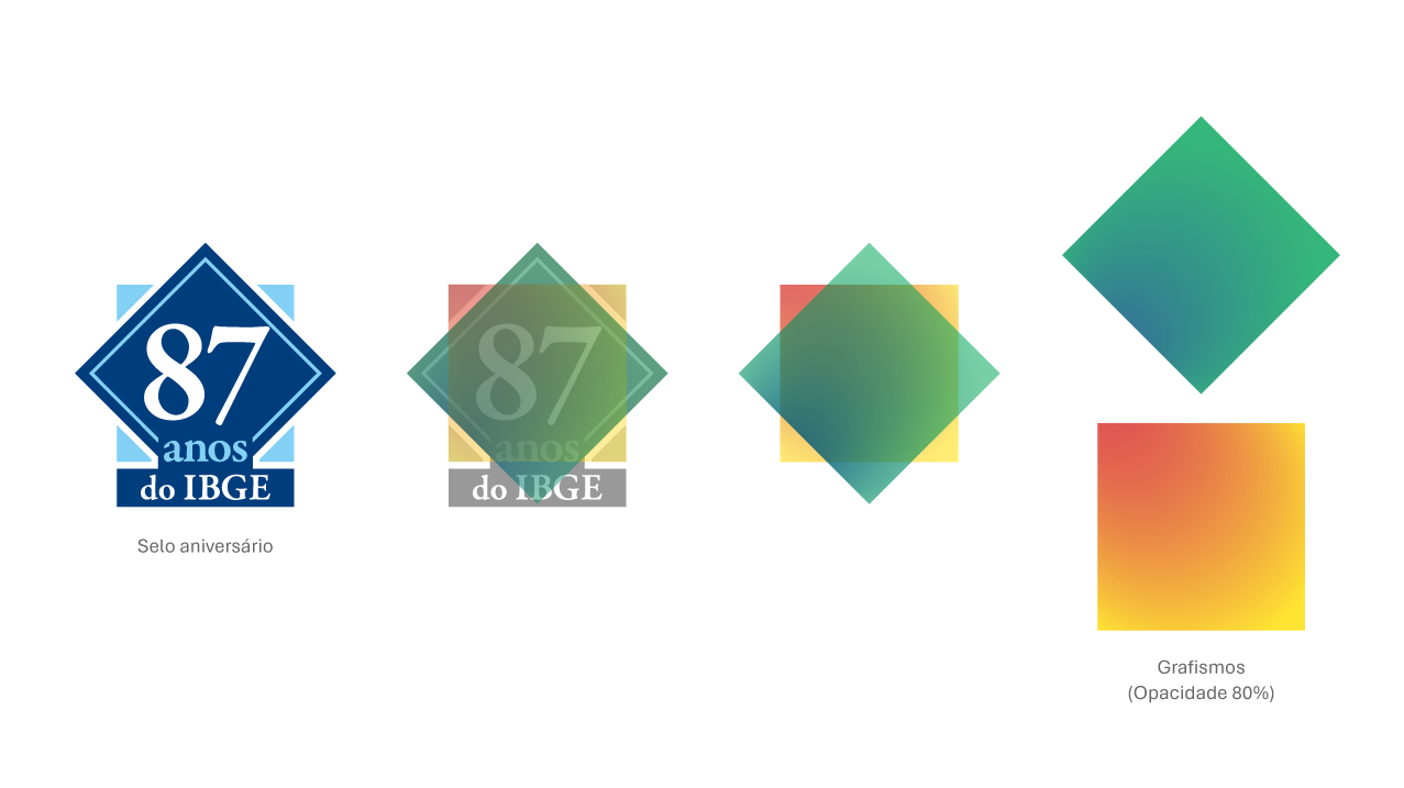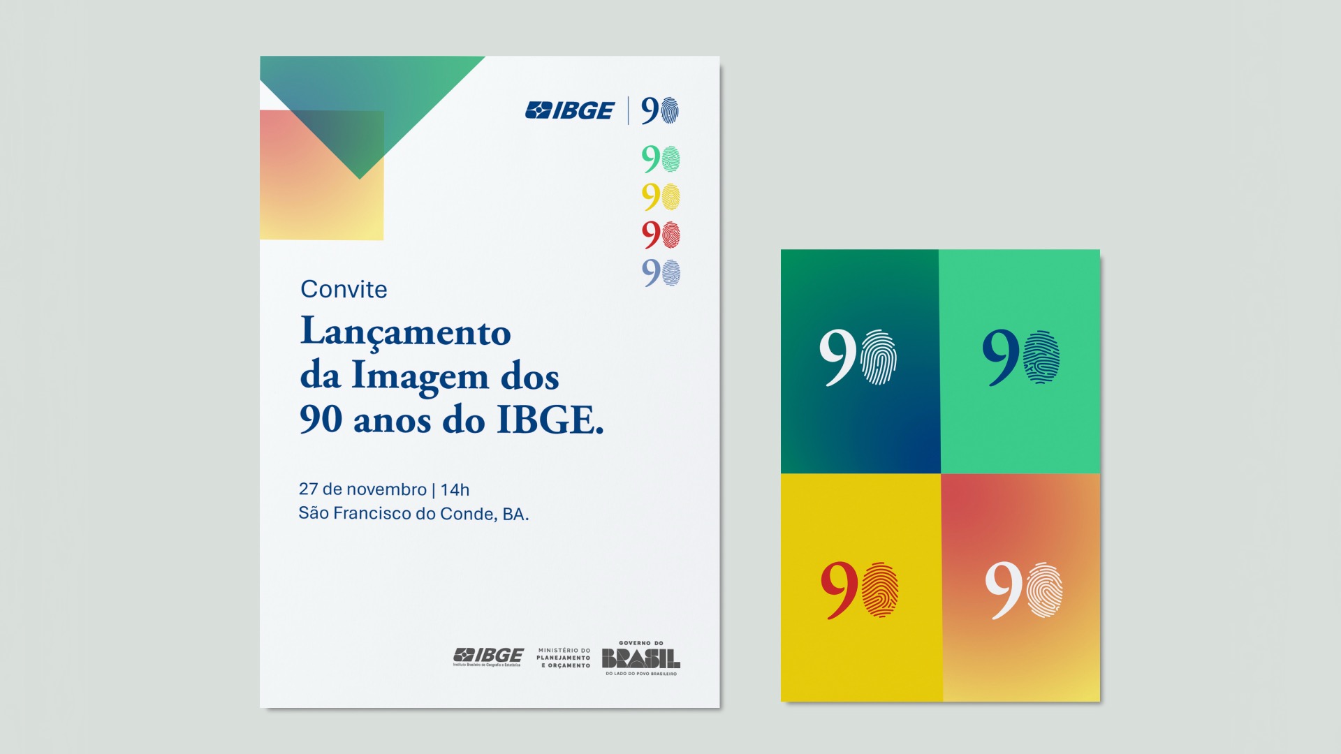 Resgatando a tradição dos selos de aniversário do IBGE e aproveitando para marcar a ideia de renovação, desconstruiu-se as formas que o compunham para formar os grafismos que amarram a identidade visual.